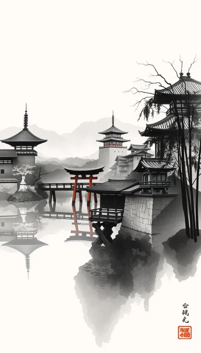 Atmosphère Évoquée: vermillon des torii, odeurs d’encens et de matcha, cloches et shamisen, bambous qui murmurent.