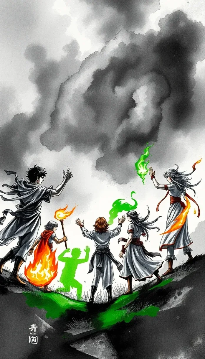 Alors que la bataille se poursuivait dans une frénésie presque palpable, une lueur d’espoir illumina leur détermination. L’union de leurs forces, qui semblait au départ une faiblesse, se révélait leur plus grande force. Ils ne se battaient pas seulement pour eux-mêmes, mais pour l’équilibre de leur monde, convaincus que leur maillon d’union pouvait contrer l’assaut sinistre. Chaque explosion de lumière, chaque souffle de vent, chaque goutte d’eau devenait une déclaration : l’équilibre était à préserver, et ils étaient prêts à se battre.