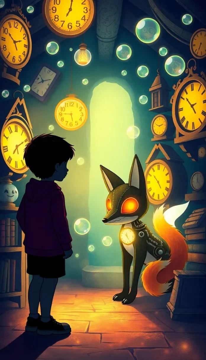 Au centre, un renard mécanique reposait, sa fourrure d’acier poli miroitant les petites lampes. Ses articulations étaient ornées d’engrenages et de minuscules horloges; ses yeux, d’un ambre doux, brillaient comme deux veilleuses. Le son qu’il émettait ressemblait à une berceuse de rouages.