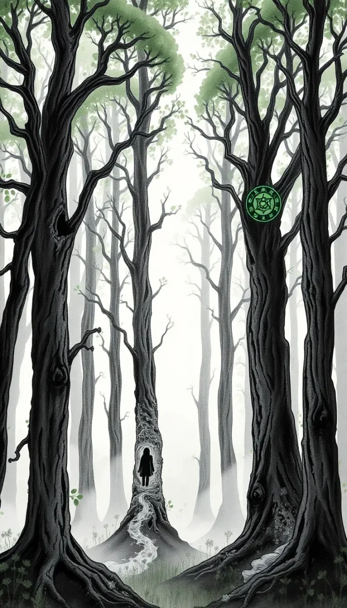 Un grand arbre à l’écorce craquelée demeurait plus immobile que les autres. Ses anneaux, révélés par l’averse, dessinaient une spirale plus nette ; au centre, la veine du bois sembla se mouvoir. Elias ressentit, d’abord, un vertige d’enfant. Aster, perché sur une branche basse, laissa échapper un croassement cognitif et resta attentif, comme pour dire qu’il fallait écouter autrement que par les oreilles.