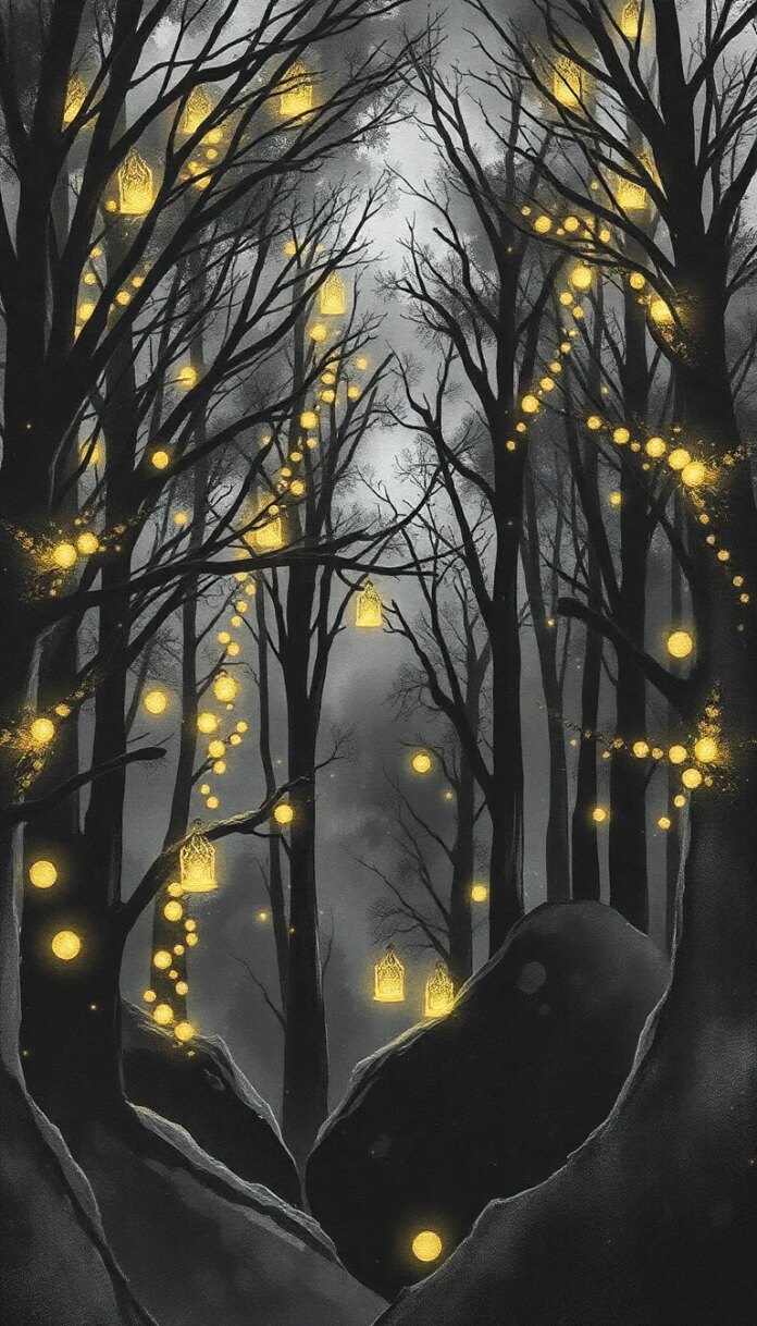 « Qu’est-ce que c’est ? » murmura-t-il pour lui-même, ses mots se perdant dans l’air frais et rempli d’odeurs d’humus et de résine. Chaque pas l’amenait un peu plus près des silhouettes dansantes qui semblaient l’appeler, brillantes et fugaces comme des rêves échappés. Soudain, un frisson d’émerveillement l’envahit, une mélodie inouïe résonnant au plus profond de lui. Elias savait qu’il ne pouvait pas rebrousser chemin. Il devait comprendre cette magie nocturne, ce qu’elle avait à offrir.