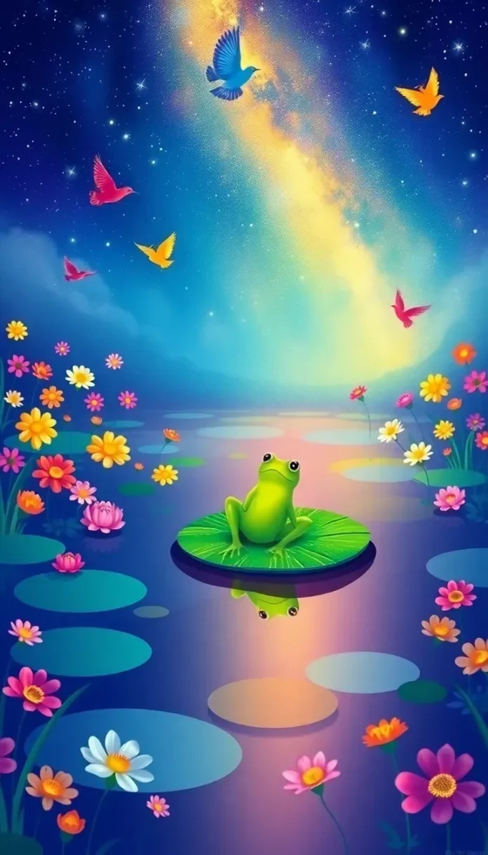 Tout en flottant joyeusement parmi les étoiles, elle se mit à chanter, le chant de la petite grenouille résonnant à travers l’espace infini. Chaque note formait un lien avec les étoiles, chaque vibration semblant lui répondre avec une mélodie douce et envoûtante.