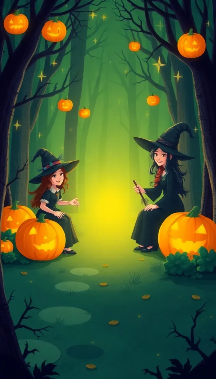 Les quatre sorcières gentilles, Clara, Lila, Mira et Isolde, se tenaient prêtes près de la porte de leur cottage enchanteur. Excitées, elles scrutaient l’horizon à la recherche des petits fantômes, des vampires rieurs et des monstres colorés prêts à célébrer. « Regarde là-bas, une momie ! » s’exclama Mira, en pointant vers une petite fille enveloppée dans du papier toilette. Les autres sorcières rirent de bon cœur, impatientes de faire la connaissance de tous ces nouveaux amis.