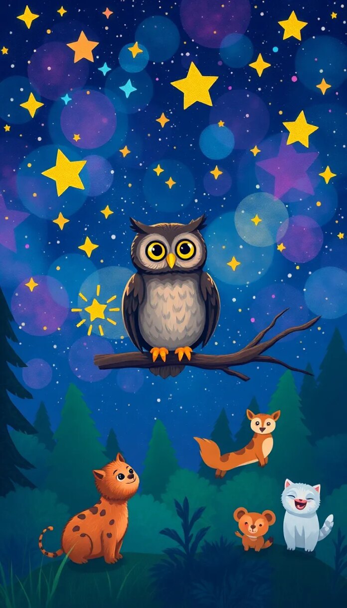 Quand le soleil se coucha derrière les collines, une douce lumière argentée enveloppa la forêt, rendant le monde encore plus mystérieux. Nico, la chouette malicieuse, se tenait sur sa branche, le cœur lourd de l’obscurité apportée par le nuage qui avait ravi les étoiles. Ses amis, les renards, les écureuils et bien d’autres animaux de la forêt, vinrent le rejoindre, leurs regards inquiets trahissant leur désir de trouver une solution.