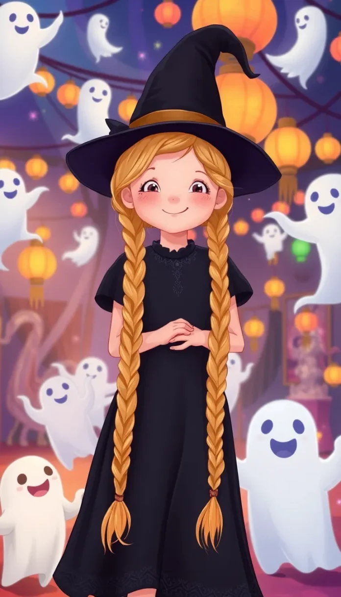 La nuit d’Halloween était enfin arrivée, et au cœur de cette soirée enchantée, Coco, une petite fille de sept ans, rayonnait d’excitation. Ses longs cheveux blonds en tresses brillaient sous la lumière de la lune, tandis que ses yeux bleus pétillants reflétaient les étoiles qui scintillaient dans le ciel. Elle se tenait devant son miroir, une robe noire ornée de petites étoiles scintillantes qui lui tombait gracieusement jusqu’aux genoux, et un chapeau de sorcière élevé fièrement sur sa tête.
