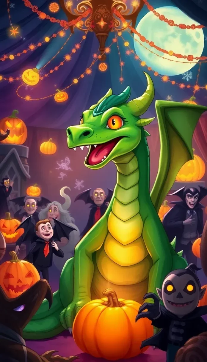 Drago, le petit dragon vert, se tenait là, un peu hésitant, hésitant à se mêler à cette danse endiablée. Soudain, une voix joyeuse l’interpella. « Alors, jeune dragon, es-tu prêt à t’amuser? » C’était Vlad, un vampire jovial revêtu d’une cape rouge flamboyante, qui brillait d’un éclat chaleureux.