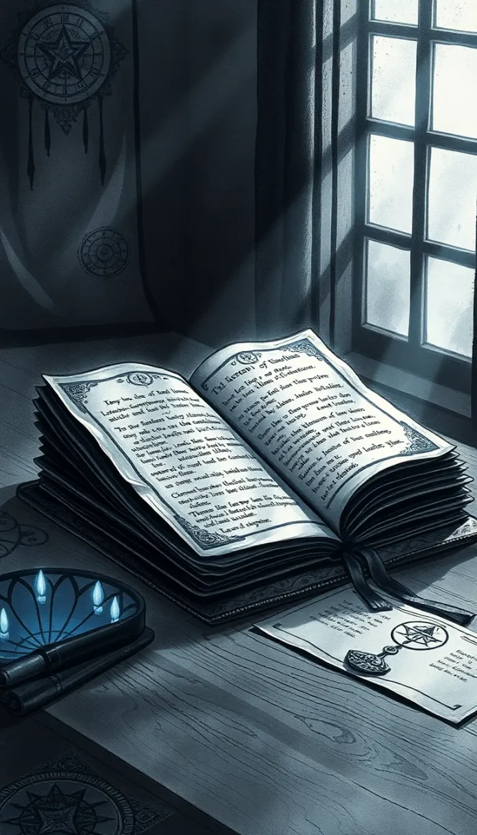 La lumière des chandelles dansait sur les murs de la pièce, projetant des ombres capricieuses, alors que le protagoniste s’installait à la table, son cœur battant d’une anticipation fébrile. Devant lui, le vieux livre, désormais usé, s’ouvrait avec un léger craquement, comme s’il était conscient de l’importance de ce qui allait se dévoiler. Les pages se déployèrent lentement, dévoilant des symboles anciens qui, au fil des jours, avaient commencé à lui parler, tissés de mystère et d’énigme.