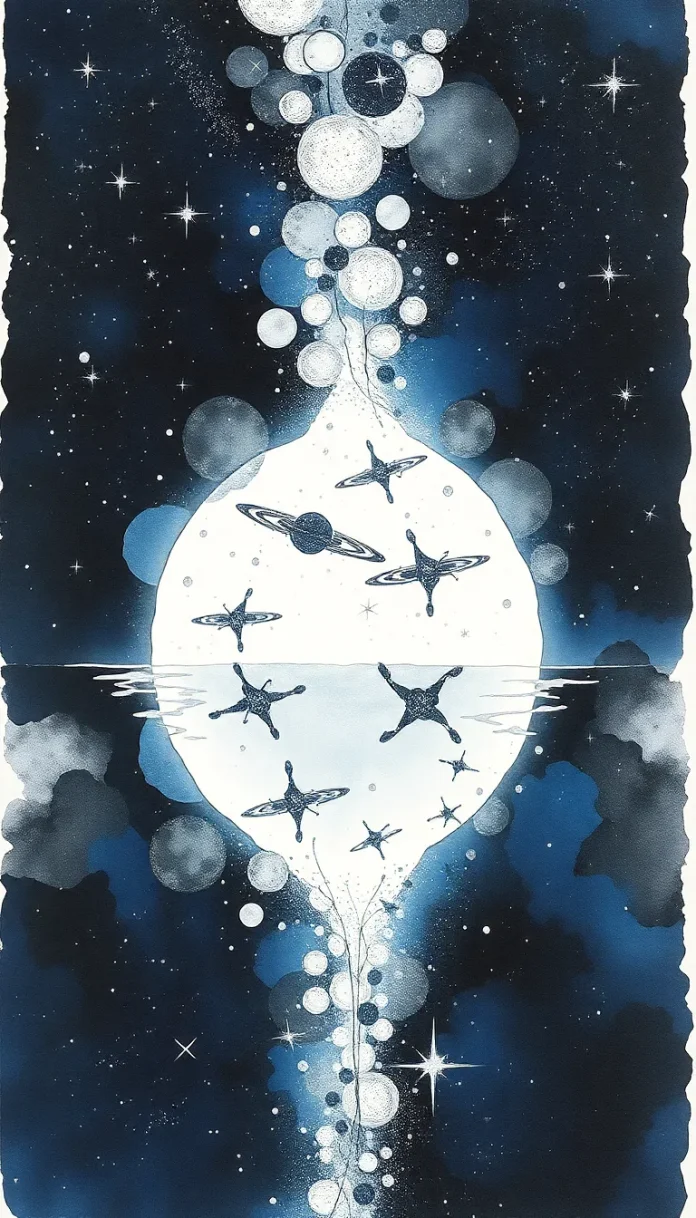 Il vit des suites d’images qui se succédaient avec la logique d’une musique : des voyageurs au visage absent, guidant leurs doigts sur des tables sonores où les positions des étoiles se transposaient en accords ; des galaxies comme des coquilles, où la navigation se faisait par la modulation d’harmoniques, par la mesure des intervalles — une cartographie de l’espace dessinée en octaves. Il entendit, sans l’entendre tout à fait, la ronde des sphères transformée en langage de pilotage.