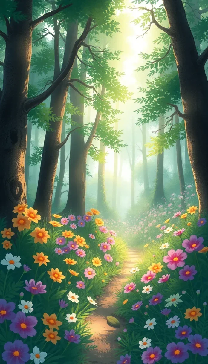 Alors que le soleil montait, déployant ses rayons en arabesques lumineuses, Papillon parvint à la clairière tant espérée. Là, un spectacle féerique se dévoilait aux yeux émerveillés de l’aventurier. Des fleurs aux couleurs chatoyantes semblaient écouter et répondre à ses pas. Chaque pétale, chaque brin d’herbe vibrait d’une vie mystérieuse et bienfaisante.