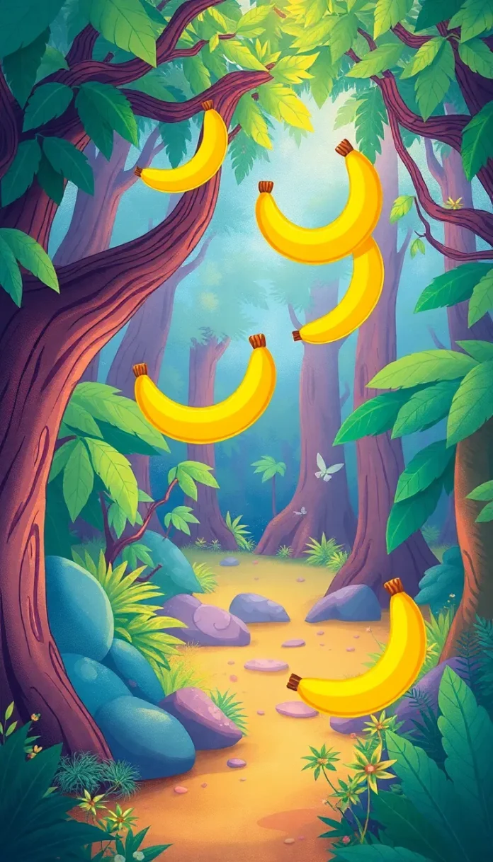 Alors que le soleil s’élevait, le Singe Malicieux aperçut au loin un phénomène inattendu : des bananes, suspendues dans les airs, semblaient flotter avec une grâce surnaturelle. Cette vision extraordinaire attisa sa curiosité et fit naître en lui le désir ardent de percer le mystère de ces fruits volants, porteurs d’une légende millénaire.