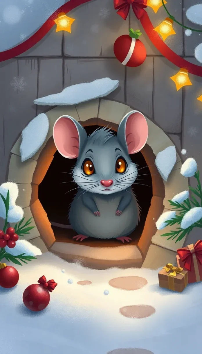 Dans un vieux mur de ferme, cachée derrière des briques en pierre, vivait une petite souris grise nommée Mia. Ses yeux pétillants et ses oreilles rondes lui donnaient un air à la fois curieux et malicieux. À cette époque de l’année, alors que les flocons de neige dansaient dans l’air frais, l’excitation emportait les habitants de la ferme vers la magie de Noël.