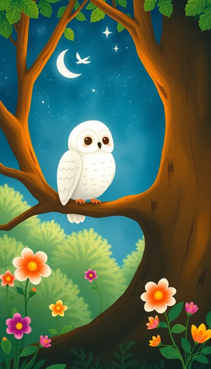 En s’éloignant un peu de son arbre majestueux, Snoopy, le hibou aux plumes douces et blanches, s’envola plus loin dans la forêt, curieux de découvrir ce que la nuit lui réservait. Les étoiles brillaient comme des diamants dans le ciel noir velouté, et il rêvait d’aventures encore plus palpitantes.
