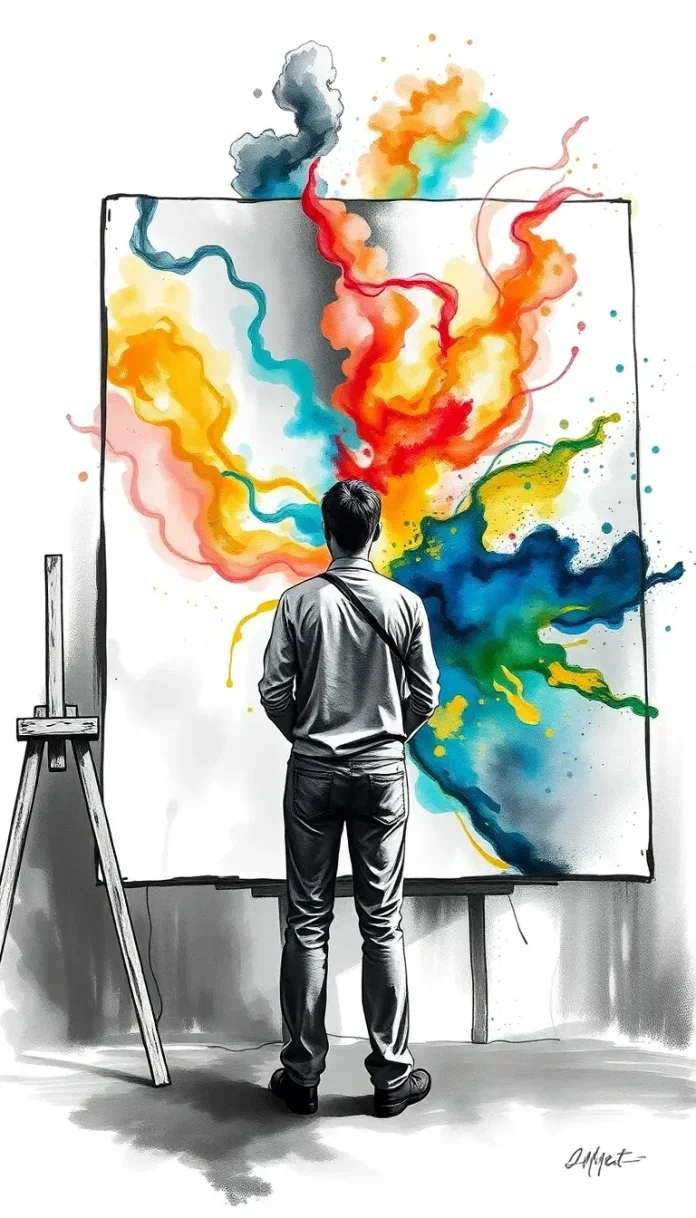 « Je vais peindre mon chaos, » déclara-t-il à voix haute, son cœur battant à tout rompre. Il lâcha prise sur ses incertitudes, lui permettant de se plonger dans cette obscurité pour en faire un chef-d’œuvre. Victor se mit à peindre frénétiquement, la toile prenant vie sous ses mains. Les couleurs tourbillonnaient, se mélangeant, s’élevant et chutant, à l’image de ses pensées. Avec chaque trait, il trouvait un équilibre fragile, une merveilleuse symbiose entre douleur et passion.