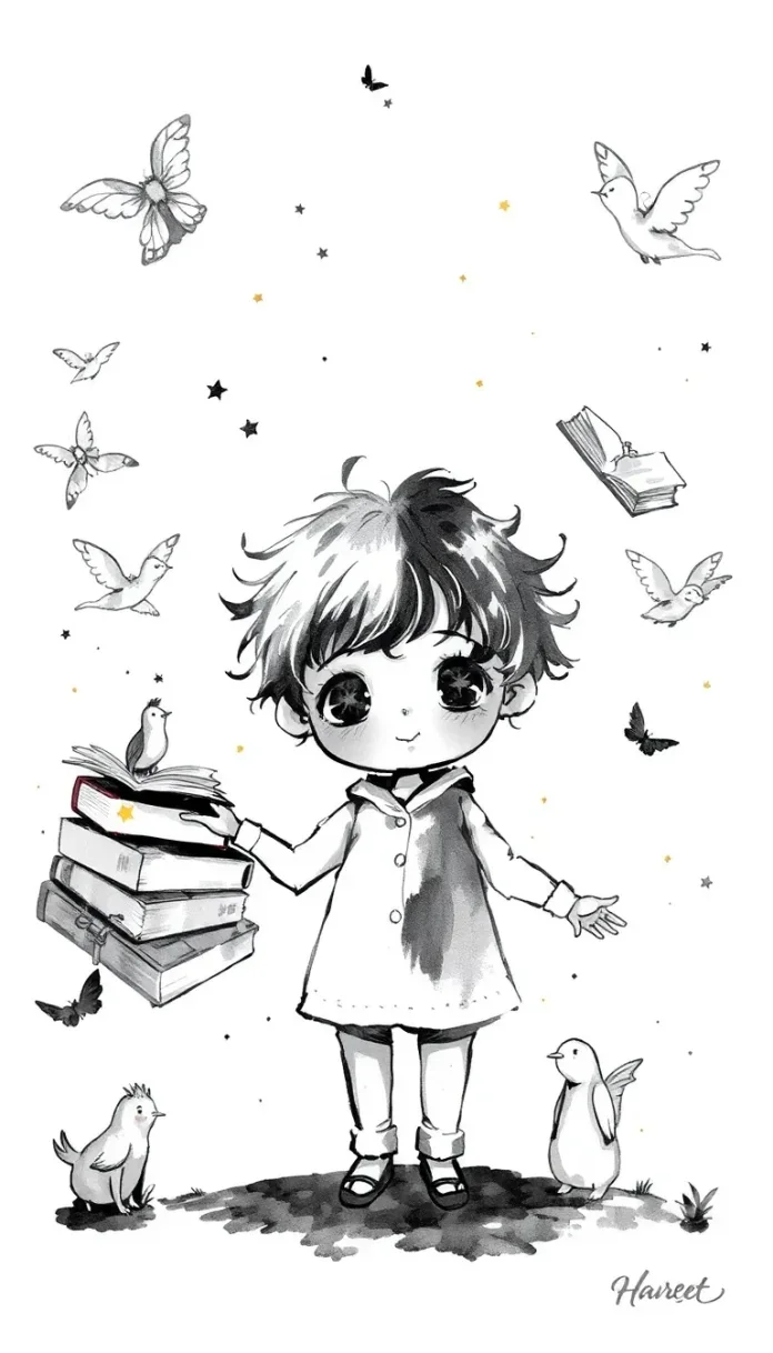 La lumière tamisée de la lampe sur le bureau d’Élise dansait sur les murs tapissés de livres anciens. Les pages jaunies d’un vieux tome ouvert devant elle, le doux parfum de l’encre et du papier mêlé à la poussière créait une atmosphère de mystère propice à l’évasion. Inspirée par les récits fantastiques qu’elle venait de lire, Élise s’affairait à dessiner avec passion. Des créatures féeriques prenaient forme sur le papier, des paysages enchanteurs se déployaient, vibrant de couleurs vives et d’histoires enfouies.