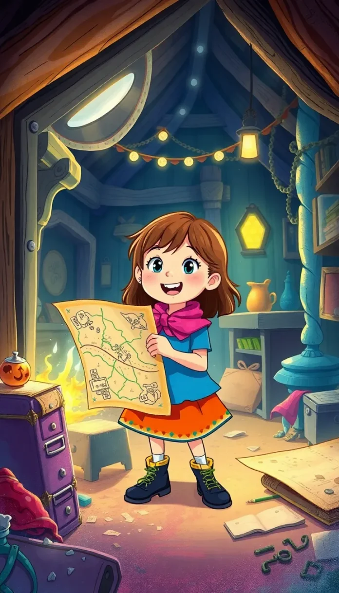 À l’intérieur, enveloppée dans une étoffe poussiéreuse, se trouvait une carte. Sophie frissonna d’excitation en l’examinant. C’était une carte au trésor, ornée de symboles étranges et de chemins sinueux, qui promettait des aventures extraordinaires. « Oh ! Qu’est-ce que c’est ? » s’écria-t-elle, les yeux brillants. Elle la déplia délicatement, faisant attention de ne pas déchirer ce précieux document. Elle ne pouvait s’empêcher de sourire en voyant un « X » rouge marqué sur un endroit mystérieux. Cela devait signifier quelque chose de très spécial !