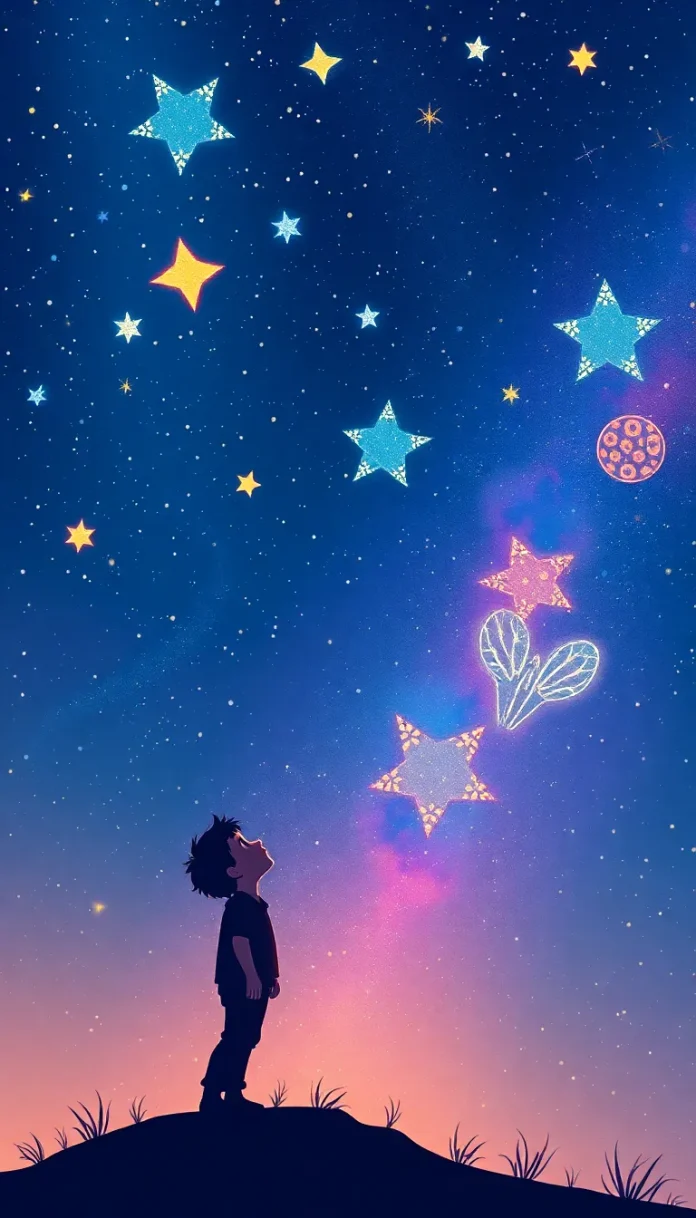 Dans une nuit d’été, où le ciel s’ornait d’une myriade d’étoiles scintillantes, Max, un enfant d’une rare sensibilité, sentit vibrer en lui l’appel mystérieux de l’univers. Sous le regard bienveillant de la voûte céleste, il s’installait sur la terrasse de sa modeste demeure, écoutant le silence empli d’infini et rêvant d’aventures interstellaires. Sa pensée vagabonde, illuminée par des songes d’autres mondes, lui parlait en murmures poétiques de contrées lointaines et d’étoiles dansantes.