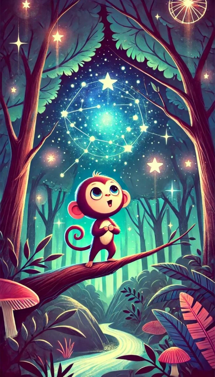 Dans la clairière enchantée, alors que la lune scintillait au-dessus de la forêt, Sam, le petit singe espiègle, s’éveilla d’un sommeil agité. L’excitation de sa récente aventure l’empêchait de rester tranquille. En levant les yeux vers le ciel, il aperçut une étoile filante qui traçait une belle traînée lumineuse dans la nuit. Tout à coup, un éclat de lumière supplémentaire attira son attention, illuminant bientôt les alentours d’une douce lueur.