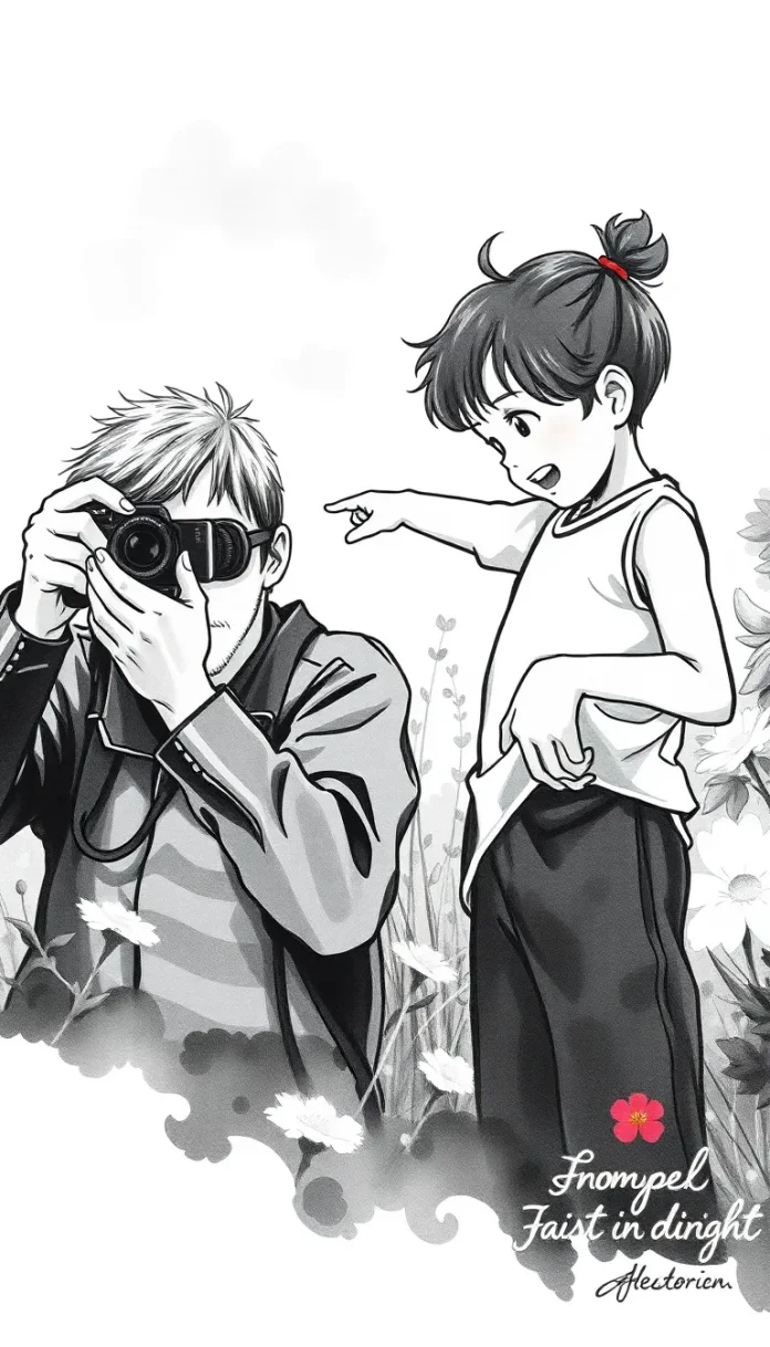 Un soir, il sortit dans le jardin avec l’instinct d’un enfant. La brise caressait son visage, et il se laissa happer par un monde vibrant de textures. Il s’assit sur l’herbe fraîche, fermant les yeux, écoutant le chuchotement des feuilles. « C’est ça, la vie, » se murmura-t-il avec une tendre mélancolie. En appuyant sur le déclencheur de son appareil fait-maison, il capturait, pour la première fois, non seulement des images, mais des émotions à l’état brut.
