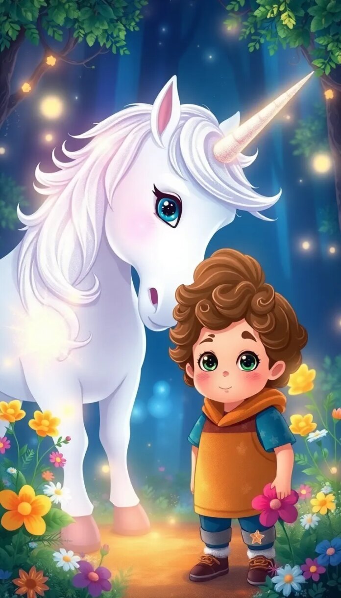 Milo, émerveillé, répondit : « Bonjour ! Je… je suis Milo. Est-ce que vous êtes vraiment une licorne ? » Sa voix trahissait à la fois la curiosité et l’admiration. Lumina hocha la tête avec un sourire rieur. « Oui, je suis Lumina, et je peux t’emmener au-delà des nuages, si tu le souhaites. »