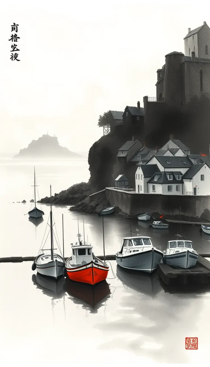 Atmosphère Évoquée: brume matinale, sel et goémon, chants de marins, corbeaux et clapotis des barques, tons gris-bleu et granit.