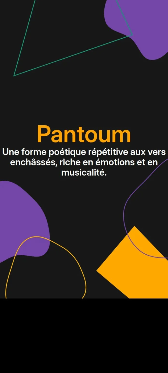 Analyse : Ce poème respecte la forme du pantoum car il est constitué de quatre strophes, chaque strophe ayant le schéma de répétition des vers, comme indiqué. Les vers 2 et 4 de chaque strophe sont repris dans les strophes suivantes, et le sens des mots évolue à chaque répétition, illustrant ainsi la richesse de cette forme poétique.