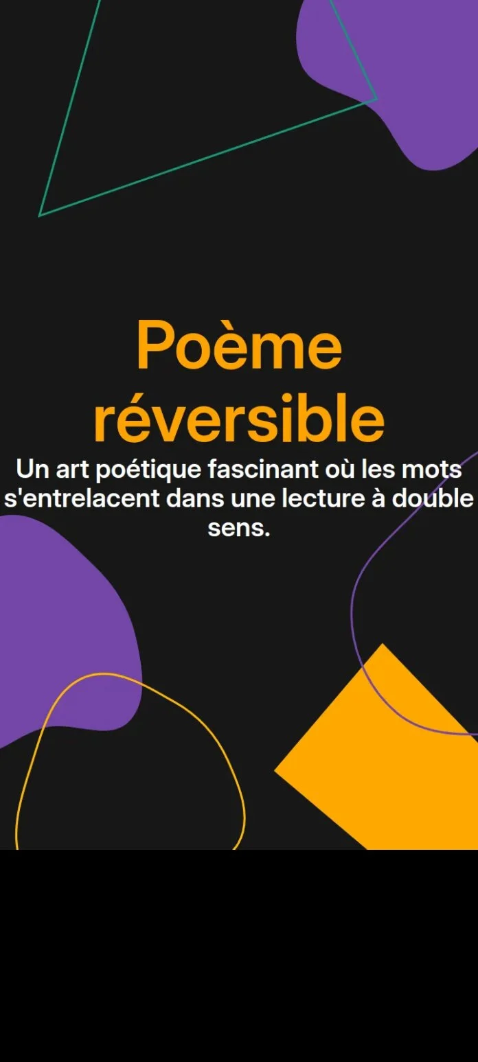 Un poème réversible, également appelé poème palindrome ou poème reverso, est un poème qui peut être lu aussi bien de l’avant vers l’arrière que de l’arrière vers l’avant, avec une signification différente dans chaque direction. Par exemple :