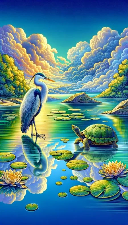 Au bord d’un étang paisible, le héron et la tortue partagent leurs pensées sur la patience et la persévérance, un échange empreint de sagesse naturelle.