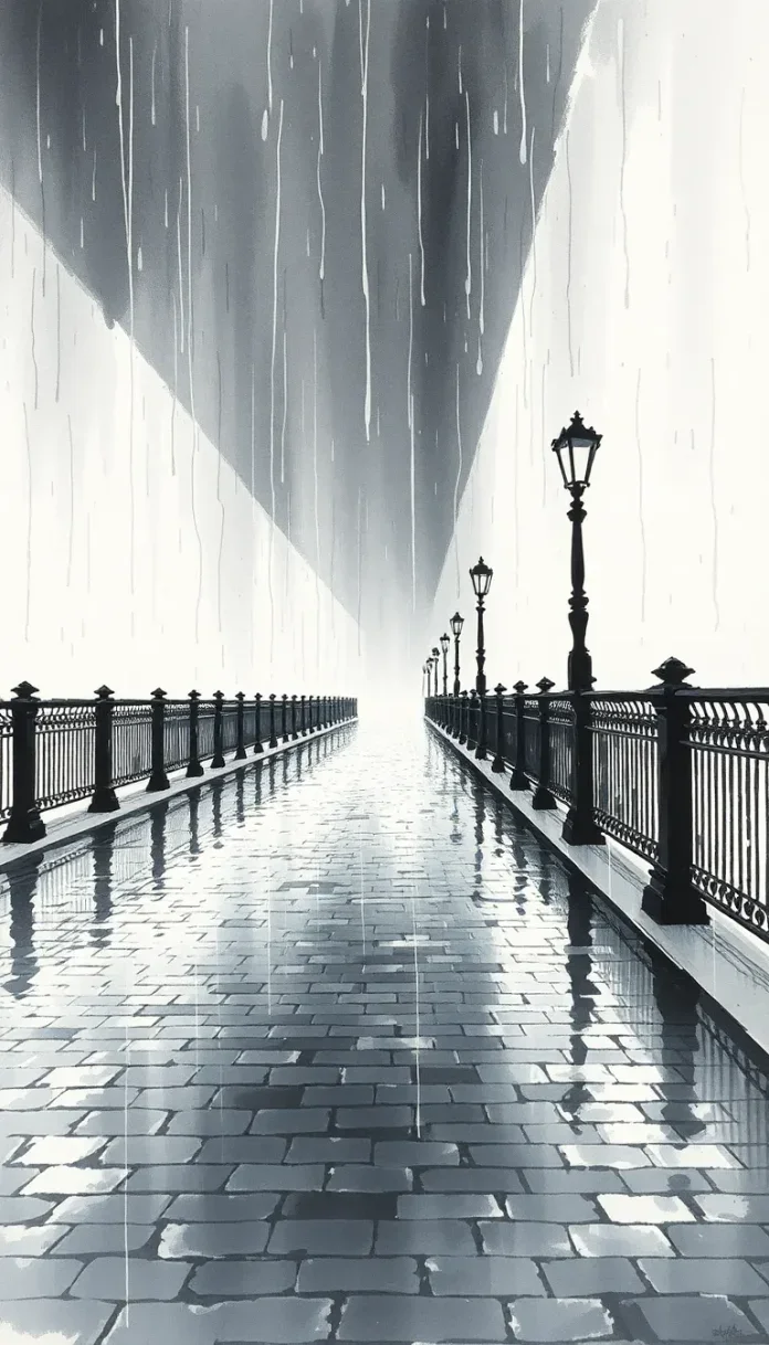 sur le pont antique, voilé de pluie et de larmes d’eau,