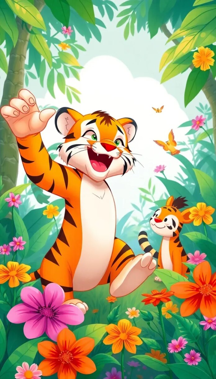Dans la jungle, un doux parfum de fleurs s’élevait dans l’air, mêlé aux cris joyeux des animaux. Tommy, le jeune tigre orange, avait préparé une surprise grandiose pour tous ses amis : un spectacle de blagues. Avec son vieux livre au chaud dans ses pattes, il avait passé les derniers jours à concocter des histoires drôles qui feraient rougir de rire la jungle entière. Ce jour-là, sous le grand baobab, l’excitation était palpable.